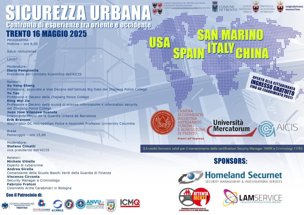 Esperti da tre continenti, istituzioni italiane e forze dell’ordine riuniti per affrontare le sfide della sicurezza urbana con approcci integrati e soluzioni condivise. Trento, 16 maggio 2025 – Una giornata densa di interventi, scambi operativi e riflessioni strategiche hanno caratterizzato il Convegno Internazionale “Sicurezza Urbana – Confronto di Esperienze tra Oriente e Occidente”, […]